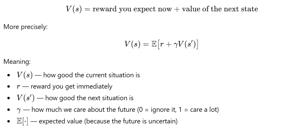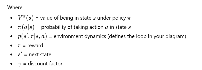 To sum this up it links: state –> reward + new state –> repeat, as the major steps of the process and the key links back into the Bellman equation.